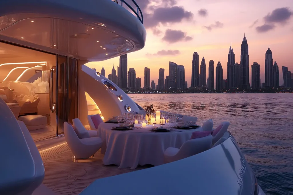 Sail into the golden hour aboard a private luxury yacht as the Dubai skyline transforms with the setting sun. This premium program includes: